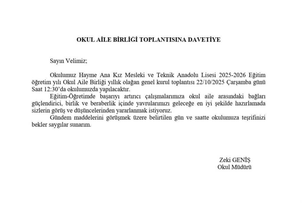 Okul-Veli iş birliğini geliştirmek, öğrencilerimizin akademik ve sosyal gelişimlerini sizlerle paylaşmak ve aramızda kuracağımız güçlü iletişim bağlarıyla onların gelişimini çok yönlü olarak desteklemek amaçlarıyla 22 Ekim 2025 tarihinde saat 12:00'da siz kıymetli velilerimizin ve saygıdeğer öğretmenlerimizin katılımıyla 2025-2026 Eğitim Öğretim Yılı 1. Dönem Okul-Veli Toplantısı yapılacaktır. Toplantıya katılımınız önemle rica olunur.